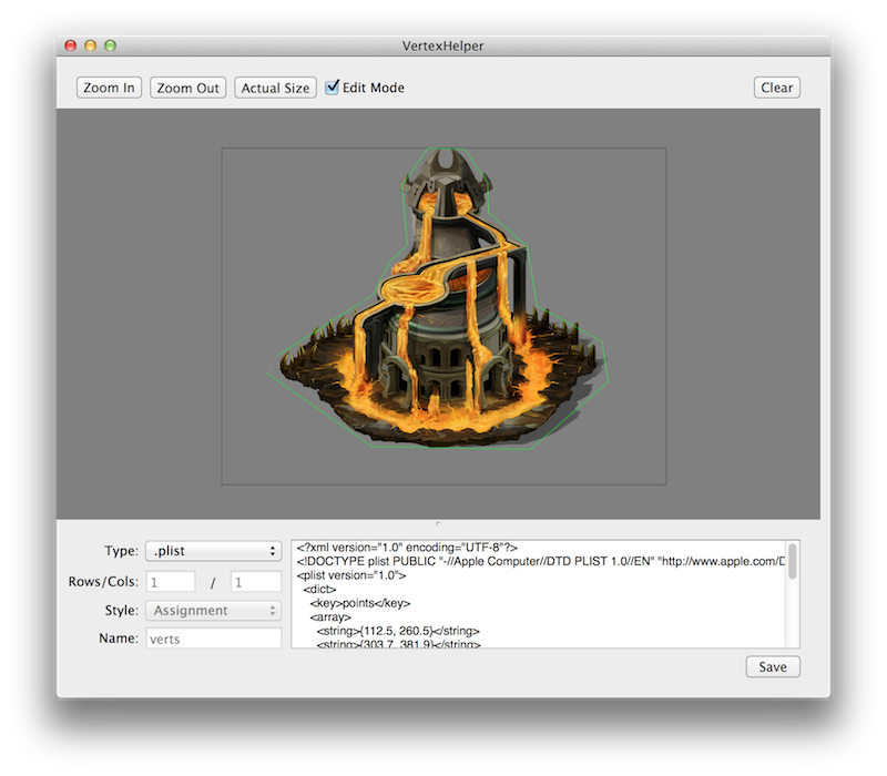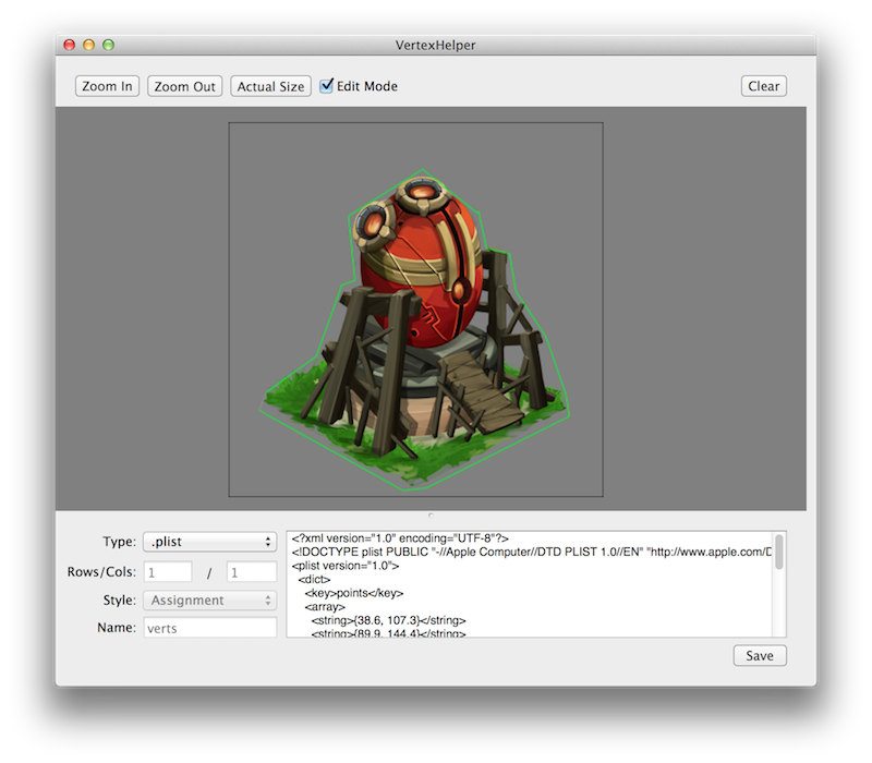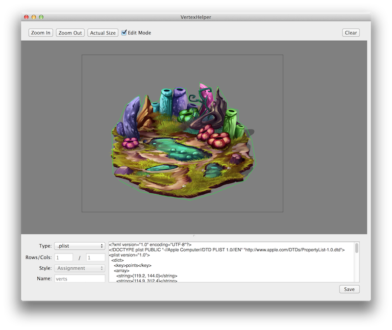 Now, I have a new version that lets you save a complex polygon as a .plist file. This let me just drop the .plists into MyDinos, read them out and then use them as the hit-test for the buildings. This turned the exhaustive proecss of building the "bounds files" for a hundred different